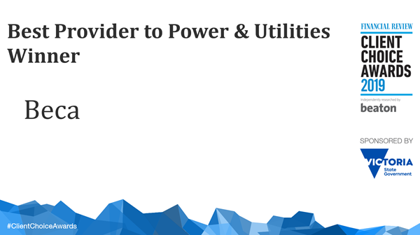 Beca’s Power and Water teams were recognised by professional services clients across Australia and New Zealand at the AFR Client Choice Awards gala in Melbourne last night, picking up Best Provider to the Power & Utilities sector for the third time in five years.