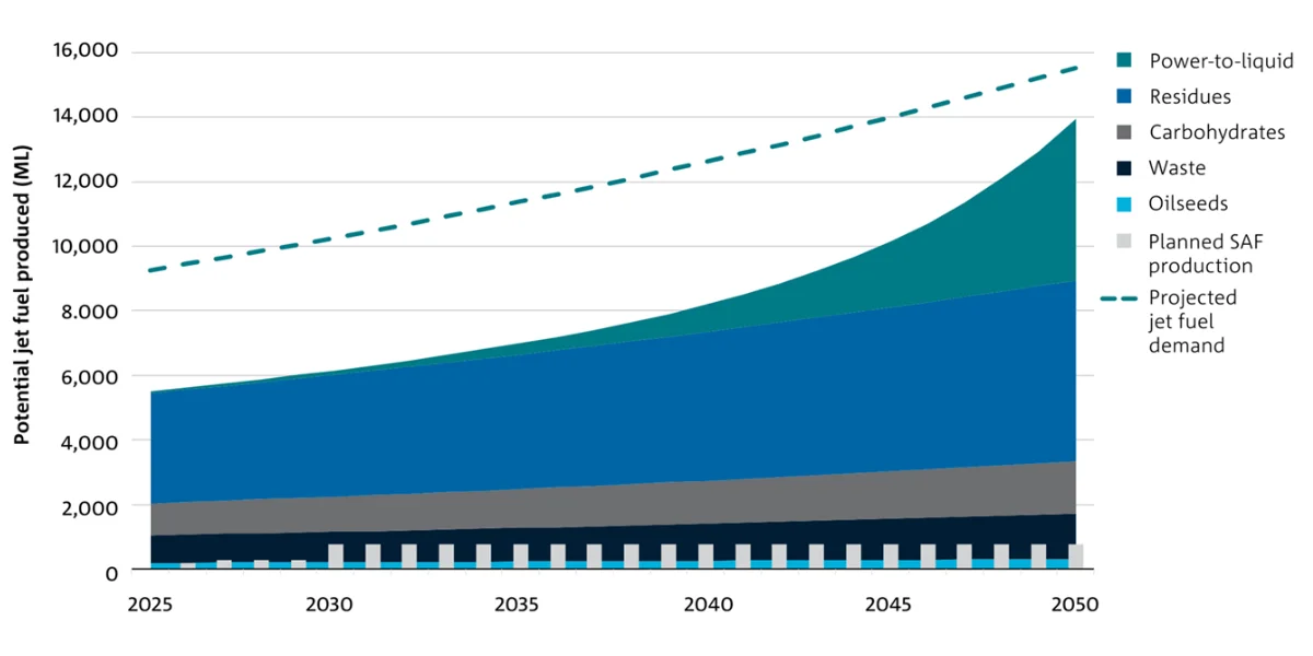Sustainable Aviation Fuel (SAF) is growing in Australia thanks to developments in power-to-liquid (PtL) and biogenic technologies. The switch to SAF is not only necessary but also timely. By 2050, air traffic will have doubled, and emissions from planes will be back to where they were before the pandemic1.