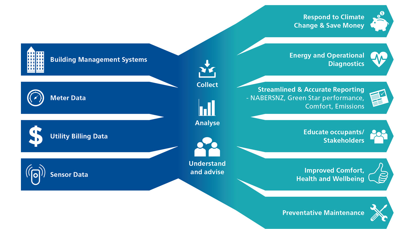 Whether you realise it or not, your building is already generating a large amount of data. We collect this data from your building management systems, energy meters, utility bills and other sources to help you reduce energy consumption, costs and emissions in three easy steps: